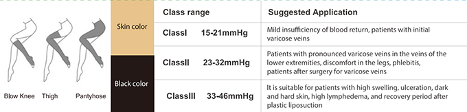 a)- Class I below knee length, 15-21mmHg, suggested application: Mild insufficiency of blood return, patients with initial varicose veins.