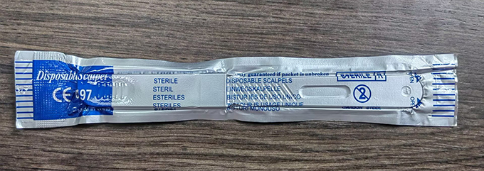 * Disposable stainless steel surgical blades with plastic handle.