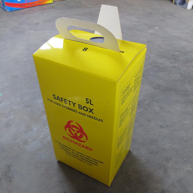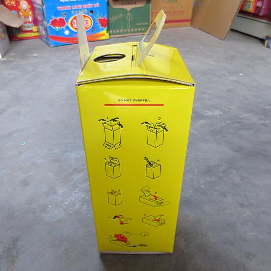* Volume: 1 L & 2 L & 5 L & 7 L & 10 L & 15 L, etc. * Capacity: 45 auto disable syringes of 0.5 ml with uncapped needles external dimensions. * Wall thickness: 0.8 - 1.4 mm. * Material: 2 layers white board paper + glossy film. * Print: 2 colors(Red & black) standard printing. * Background: white / yellow. * OEM: ok. * MOQ: 5,000 pcs * HS code: 48192000. * Packing: Bulk.